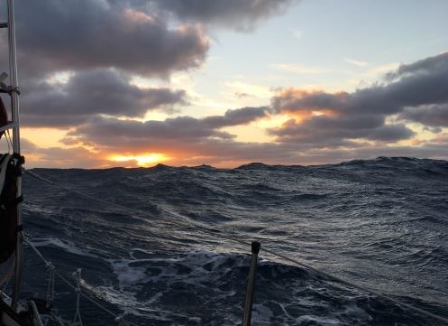 Monday evening - very grey cloudy sky and gusty wind from WNW - making around 5kt on ENE course. Difficult to head downwind in swell that knocks the boat around and causes the headsail/genoa to collapse at times.