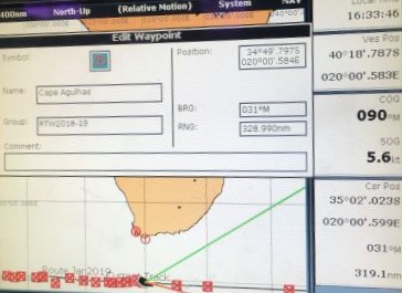 Distances (at 1900Z): Cape Agulhas LH (S.Africa): 330n.ml. to N; Cape Town Hbr entrance: 396 n.ml. to N; Cape Horn LH: 3380 n.ml. to SW; Montevideo: 3537 n.ml to W; Buenos Aires: 3636 n.ml to W; Rio de Janeiro: 3378 n.ml. to WNW.