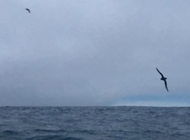The usual group of birds is close by - four storm petrels circling us, yellow-nosed albatross came gliding by, two pairs of white-chinned petrels and a great shearwater. Was amused to see a white-chinned petrel being followed closely by the shearwater for quite a way - companionship??