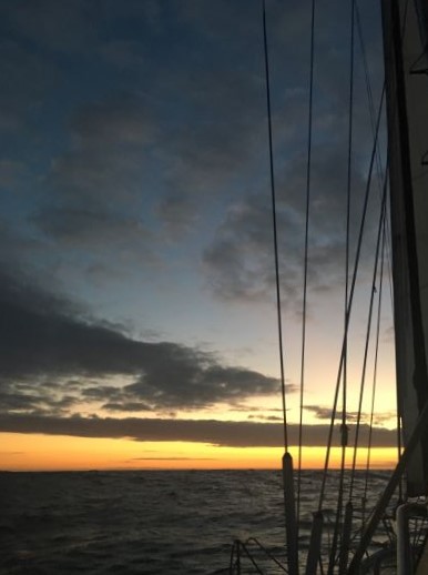 Sky is full of low, dark grey-blue rain clouds and wind has definitely died down a lot - we're only making just over 5kt now. Light is fading.