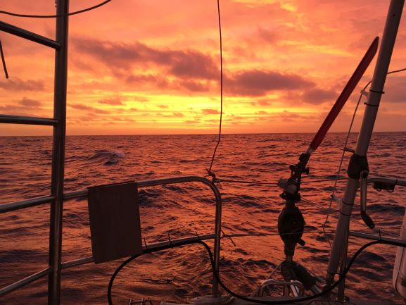 Took photos (by request!) of the seascape yesterday afternoon, trying to show the rough seas - they never look as dramatic as in reality! Also noticed I'd forgotten to post a lovely sunset on Wednesday evening when I was down below and the whole cabin was lit up with the orange light coming through the clear companionway washboard. Caught my attention and I went up on deck to enjoy it - don't often see the sun these days. The best that happens is the cloud layer occasionally gets a lot brighter - but the sun rarely shines through completely. (Solar power coming in pretty well, despite that.)