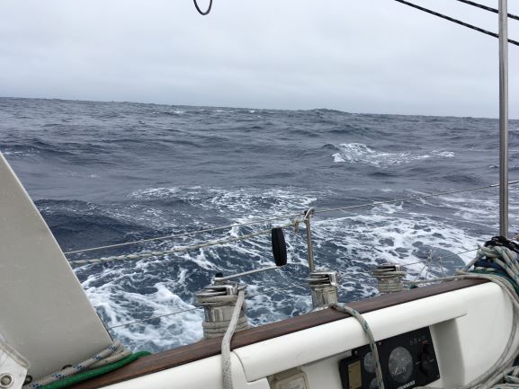 There's the usual overcast grey sky and very lumpy seas - we were being thrown around a lot on a close reach, banging into the seas quite a bit and the seas have been frequently washing over the decks and even over the hard top, into the cockpit. Wind has backed into NE and increased at times from 18kt to 21kt and still backing, so I changed course slightly relative to the wind - adjusted Fred to head more off the wind (nearly on a beam reach now) and eased the sheets. Also furled in some more genoa. We're still making over 6kt.