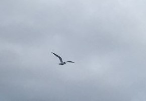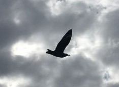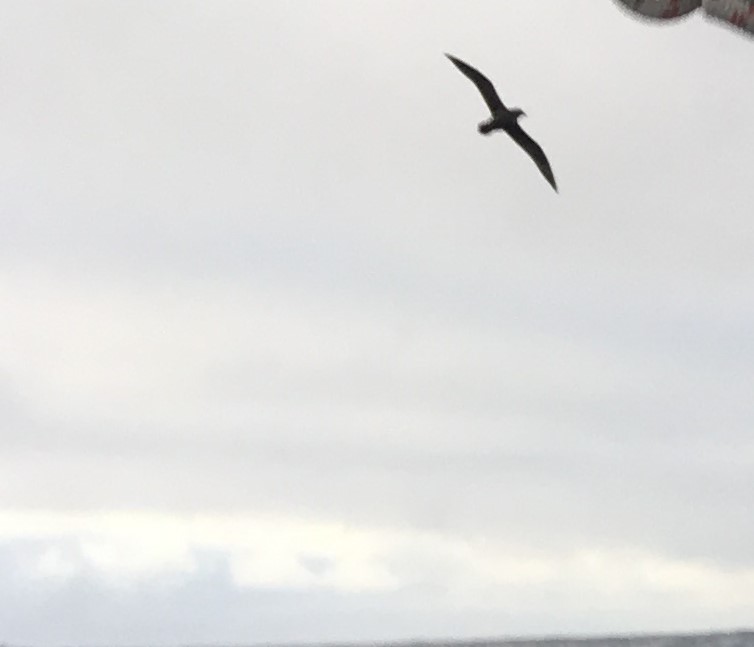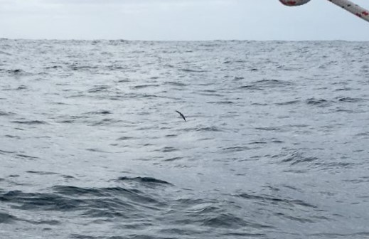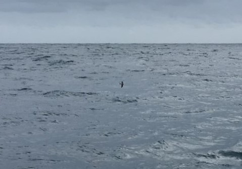 Monday 7:30pm Sunset a short while ago but grey clouds on W horizon. Lots of birds flying around near end of day - albatross in distance and a group of white-chinned (spectacled?) petrels close by - couldn't see well enough to determine if they had any white around eyes.