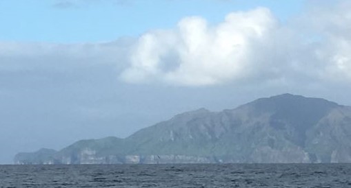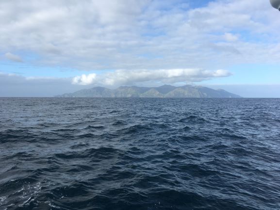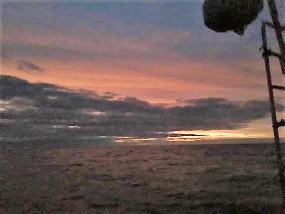 Tuesday 2:30am Passing the north of Gough Island - visible only as a dark high mound - its mountains rise to nearly 3,000m - no lights since uninhabited except for lots of birds and a S.African scientific team of 10 people in their base halfway down the E side of the island. A waning crescent moon, hazy behind thin cloud, throwing very little light over the sea. Light wind, slight swell in the lee of the island, making only 1.2kt.