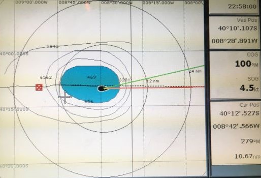 11pm Clear sky overhead - lots of stars but no moon. Heading off Gough Island by about four miles. No hazards - coast is very steep-to and ocean floor drops to 2,000m or more where we'll pass by. Slow progress at 2.5kt!