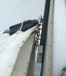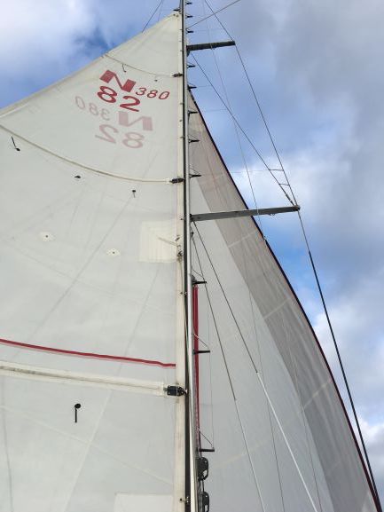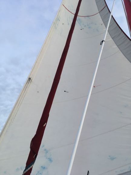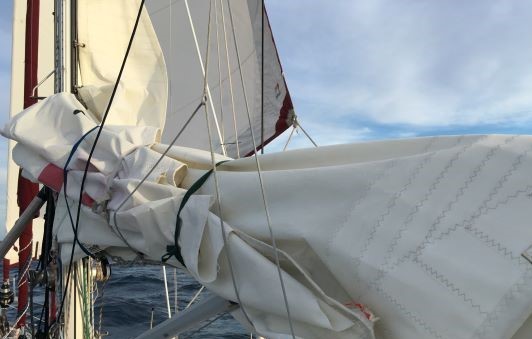 COMMENT: Mainsail lowered and tied, ready for repair - under headsail (genoa) alone.