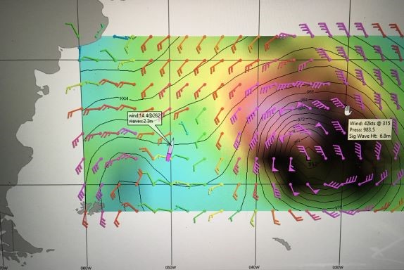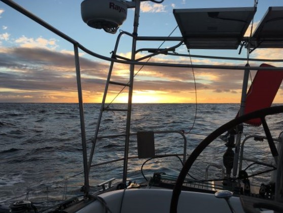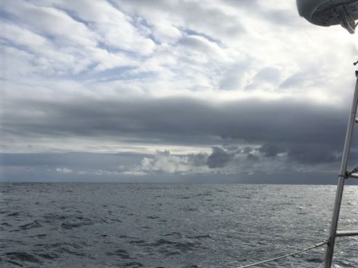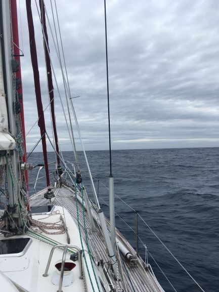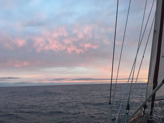4:45am Course adjusted - wind keeps shifting a little and want to keep heading E. To N is High pressure with light wind, to S is stronger wind - not good for damaged mainsail. Sent off Position and weather report and checked on radio emails while have connection - lose that by morning, until later in day.
