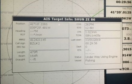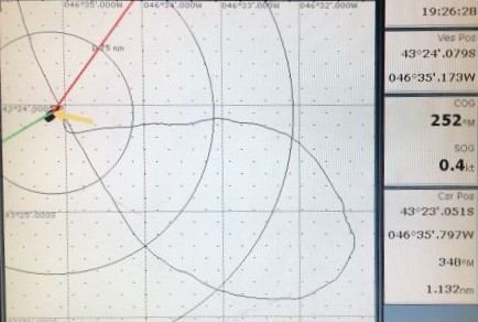 TIME: 2019/01/20 19:00GMT LATITUDE: 39-33.51S LONGITUDE: 025-32.53W COURSE: 082T SPEED: 3.6kt