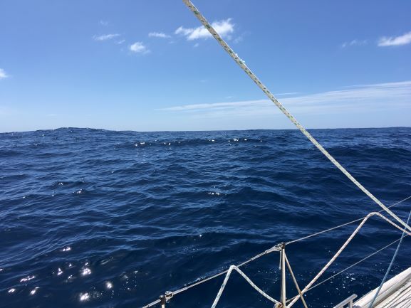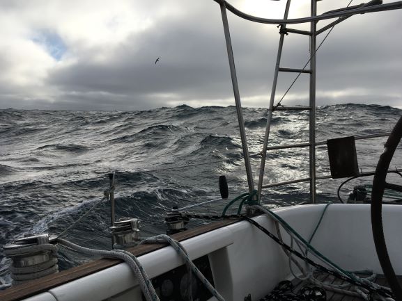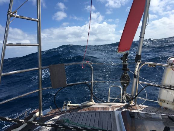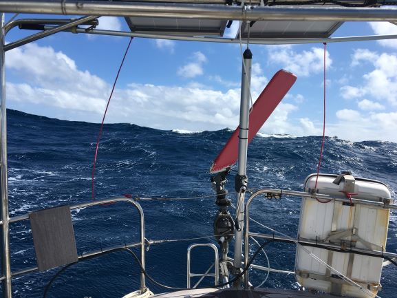 10am Bright, sunny day with just a few small white clouds but seas still well up. No birds to be seen. Adjusted Fred to keep E course. Wind dying and veering to WSW - only making 2.5kt now.