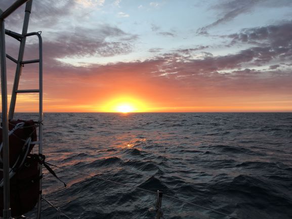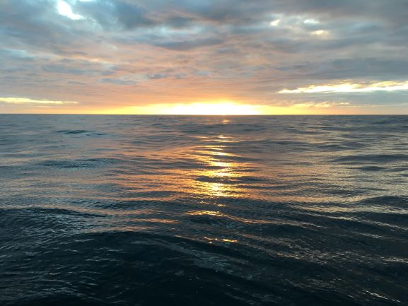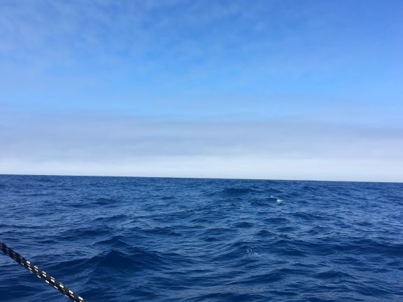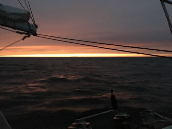Friday 4am - Dawn a short while ago - Clear sky except for a grey bank of what looks like a seafog layer dead ahead, on the horizon. No birds seen, as yet. Adjusted Fred.