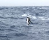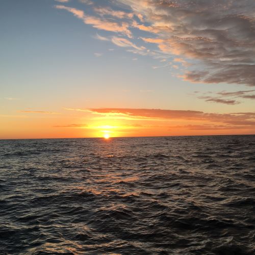 7:30pm Sun is a bright orange ball about to sink down out of sight over the blue sea - a lovely sunset. Lots of birds wheeling around - a flock of prions, storm petrels, great shearwaters - all enjoying the wind and waves and clear blue sky, as we are.