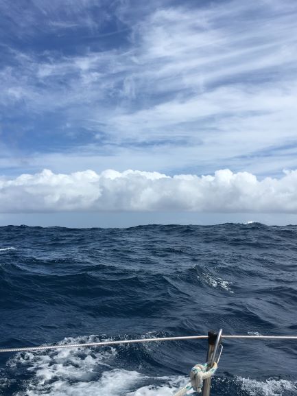 8:30am Bright sunshine and blue sky overhead! White cumulus ahead and spreading alto stratus well astern - hope it doesn't sread over too much, too soon... Wind W14kt, on broad reach.