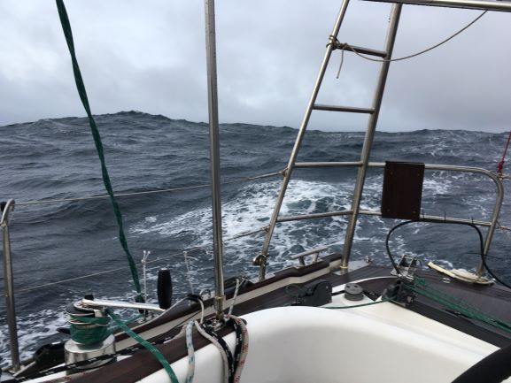 Saturday 7.30pm Some rain and grey skies. Wind, still from N, has got up some more but not too much - maybe 20-25kt - and seas much the same as earlier - about 3m or more, quite close together so keeping us rolling around a lot.