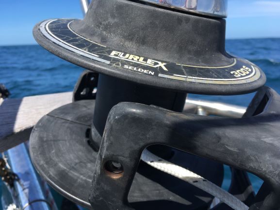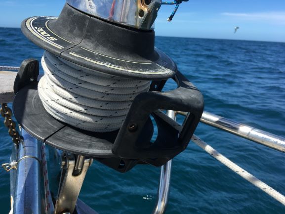I had to get onto the foredeck and untwist the line and position the drum correctly, starting to furl in the sail as I did so, and then keep tension on the line as I slowly inched my way back to the safety of the cockpit. That meant keeping the line in tension past its various stanchion fittings until I finally reached the clutch by the aft deck...