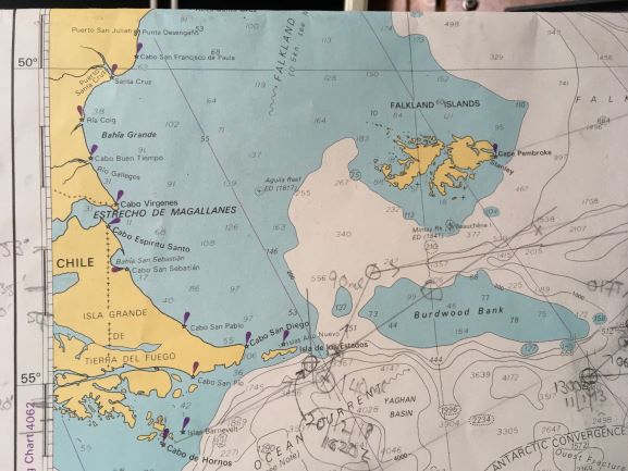 Distances (at 1900Z): Cape Horn LH: 840 n.ml. to SW; Falklands: 410 n.ml. to SW; Buenos Aires: 830 n.ml to NNW