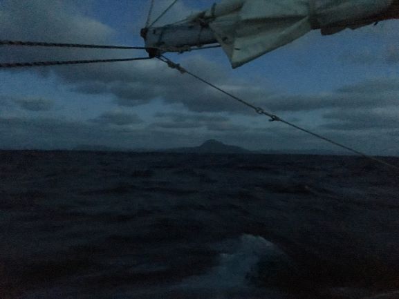 5am Low grey cloud layer ahead has disappeared - must have been overnight sea fog. Back to my bunk for more sleep - keeping an alarm set to keep eye on our course relative to wind - still veering so will need to gybe at some point soon, in order to maintain course.