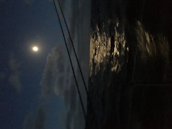A beautiful sight when I went on deck to tack around .... Bright moon high up, ahead of us, a silver-bright Venus above the W end of the orange/yellow strip of light on the S horizon and a clear sky overhead. The wind and seas were well down and suddenly it felt so much more peaceful - I felt myself relaxing...