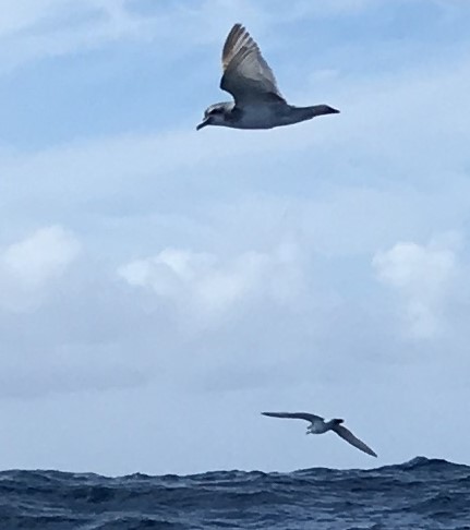 The sun has just come out and several prions are swooping about the boat, low over the water.