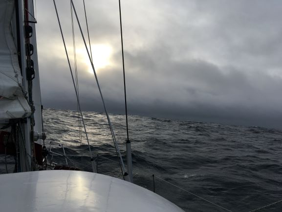 Midday Wind NNE-NE so our course is now NNW. Total cloud cover still, slight rain.