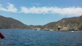 The view out to sea is of the wide entrance with rocky hillsides and occasional large vessels heading in or out of the major port of Manzanillo well off in the distance.